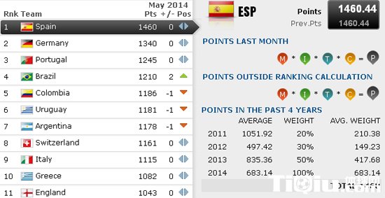 【导读】北京时间5月8日,国际足球联合会公布出最新一期的国家队排名,前三位未产生任何变化,前三依次为西班牙、德国与葡萄牙。世界杯东道主巴西队上升两位排至第四位,传统强队英格兰、荷兰与法国仍然排到十名以外。