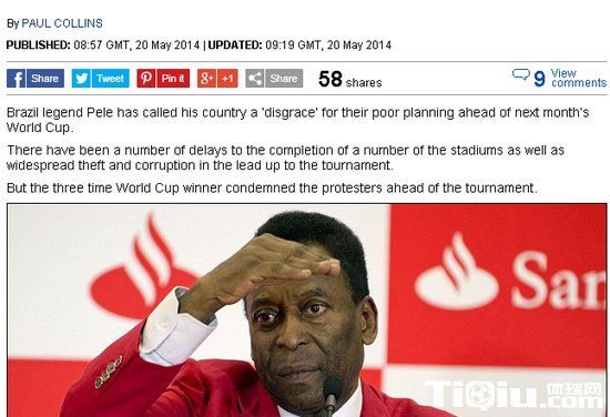 在谈及巴西世界杯场馆的施工情况时,贝利批评道:“本来巴西有充裕的时间来完成场馆建设,但目前的情况让人难以接受,这是一种耻辱。政治局面非常困难,因腐败导致场馆建设推迟,我们无能为力。我很担心,偷钱的坏人应该受到谴责,不过人们不应该使用暴力。”此前爆发了枪击腐败等等的丑闻,这显然让贝利感到很沉重。